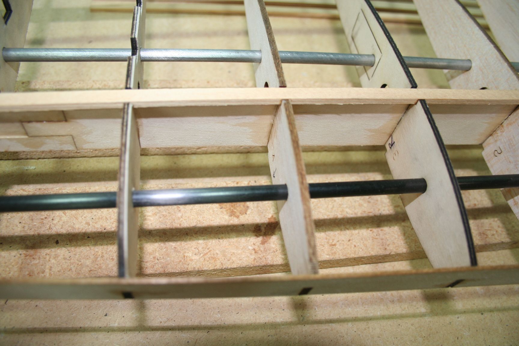 Close-up of carbon fiber rods and spruce spars