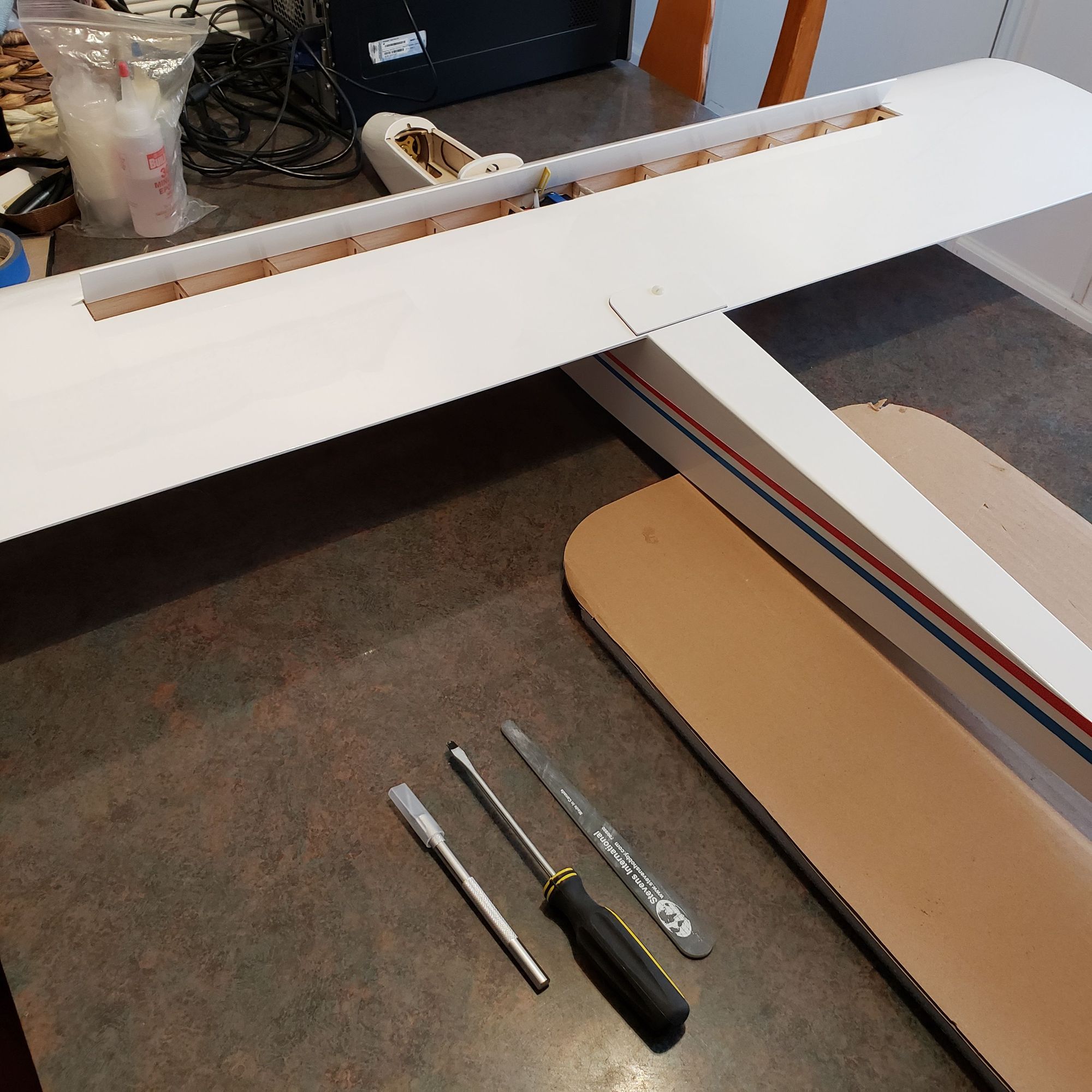 Spoiler completed and assigned to CH #5 (Gear) on Futaba radios. Servo also reversed as stated earlier. THIS is what I like to see on an open section of wing, BALSA and PLY wizardry and beauty! Love the classic design of the Vista line. Vietnamese (or whatever) ppl really have this thing licked don't they? I just hope we don't eventually see all small to medium sized airplanes going "Nerf". That would be so sad. How they make these so inexpensively is beyond comprehension.