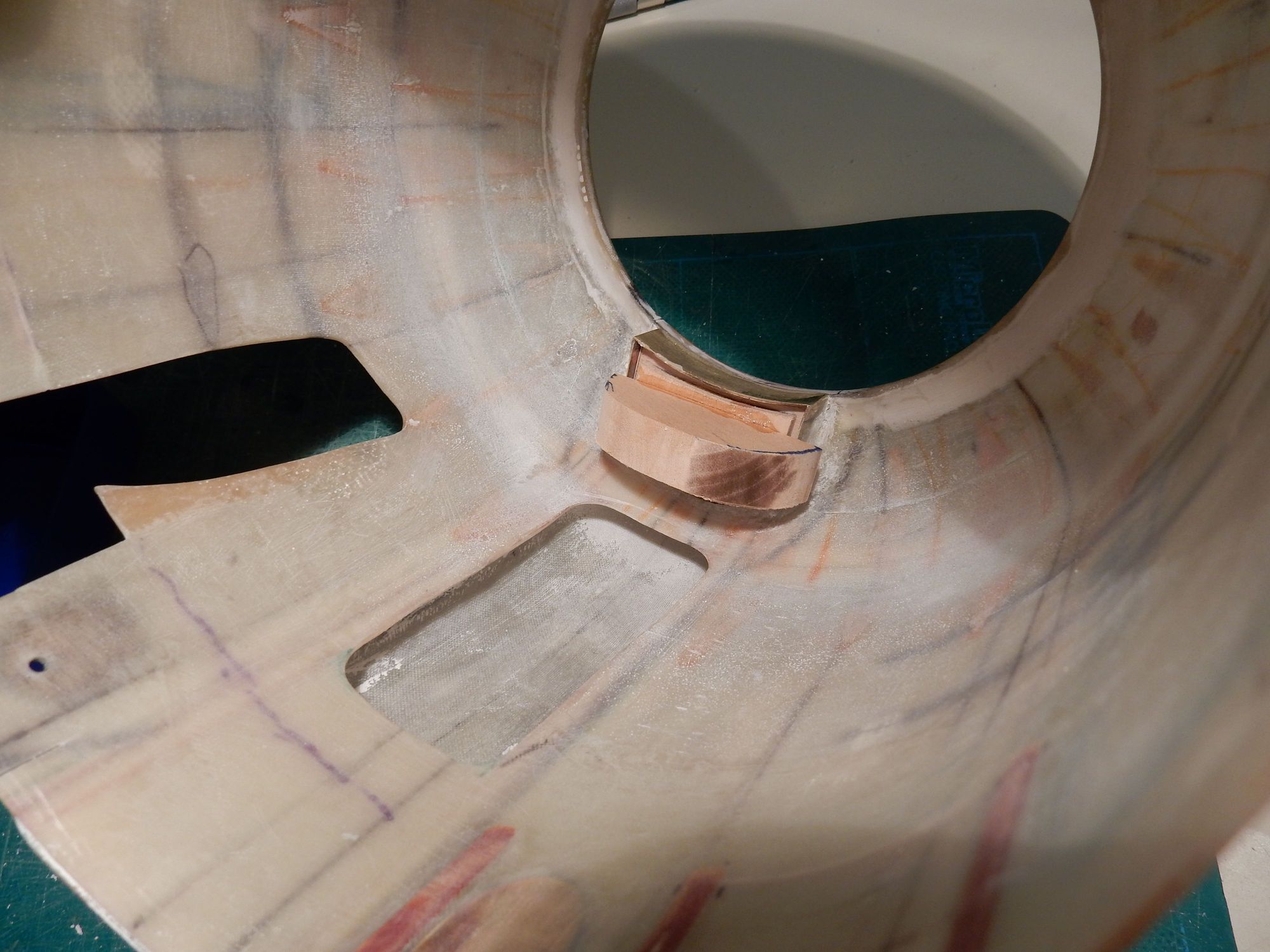 Ledge stop, Vaselined and in place to form Bondo fillet on inside lip front.