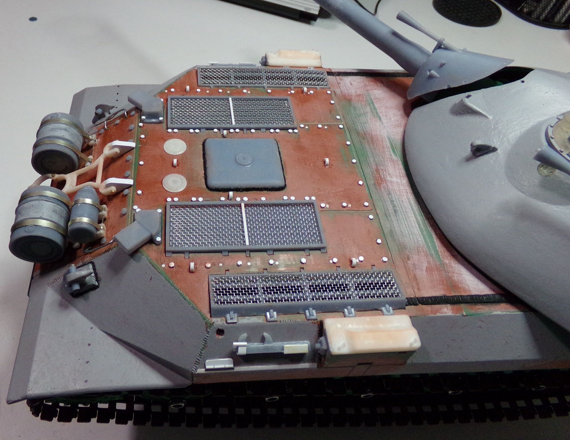 Added the track jacks and holders. Started mocking up the fake hinges for the bins which run the length of the lower hull. The rear two bins on each side contain a collapsible auxiliary fuel bladder. Still need to add more weld beads and the machine gun barrels. Still need to create a fender support and mock up the fuel hoses going into the side fuel tanks. I actually filled all the holes on the rear deck and repositioned all the deck bolts according to pics/video of the real IS-7.