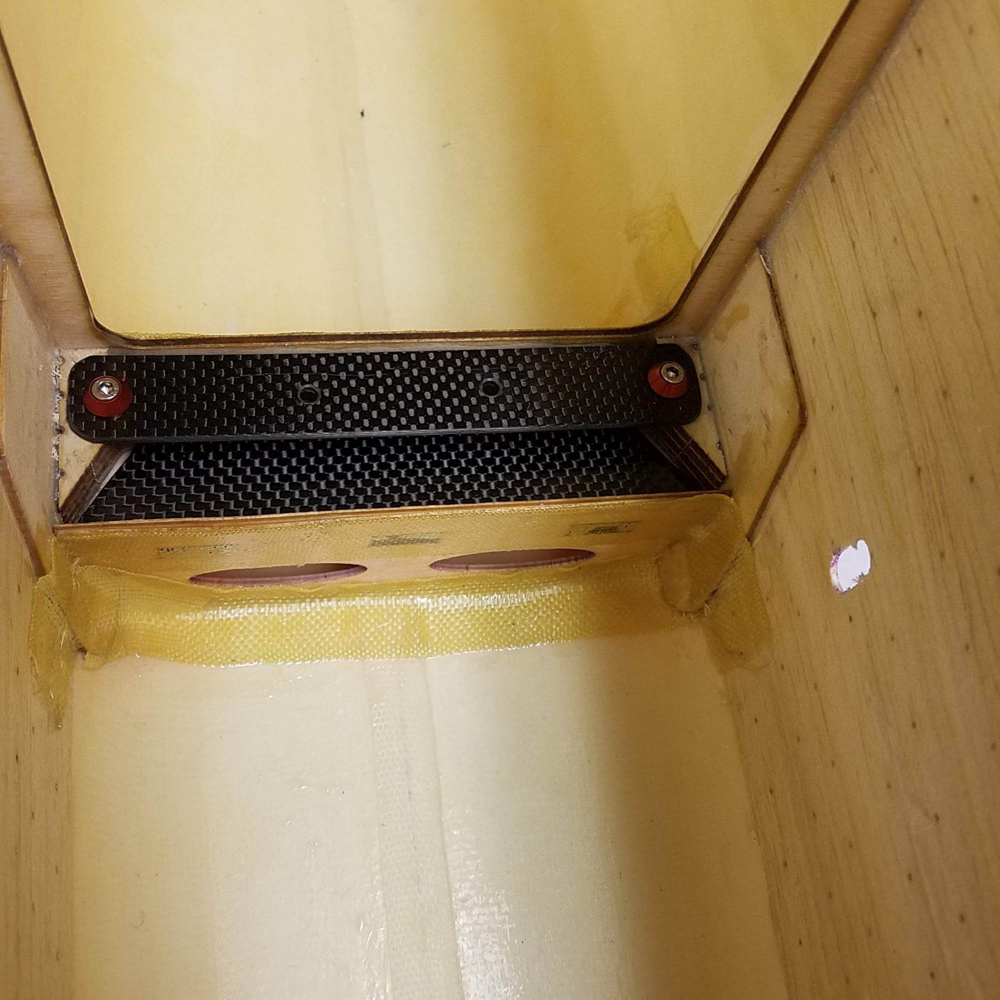 Landing gear mount reinforced with Kevlar tape and carbon fiber plates